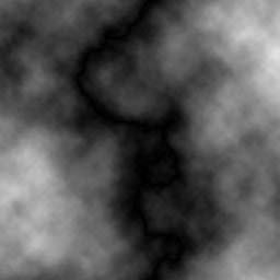 Filter using Difference Clouds. This is the fun part. Go to Filter (one of the choices at the top of the screen...), then go down to Render, then select Difference Clouds. BAM! Suddenly this looks a whole lot like a grayscale to height map, now doesn't it? Heh heh. That black, wavy line will be the river once you get this terrain into Bryce where it belongs. If you don't like how your river turned out, just use Undo (Control-Z in Windows) to get your original gradient back. Or, reload, or re-drag the gradient, or whatever. Then redo the filter (Control-F is the hot key for this). You get a different river every time you filter it! Ooooh, aaaah, neat ain't it.I usually try it a few different times till I get a river I like. Here's the two gradients from above, filtered: